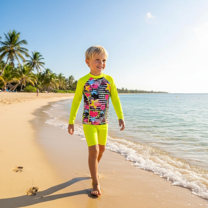 Our fluro coloured swimsuits help you with seeing your child on the beach, and in and around water but DO NOT replace constant adult supervision!.